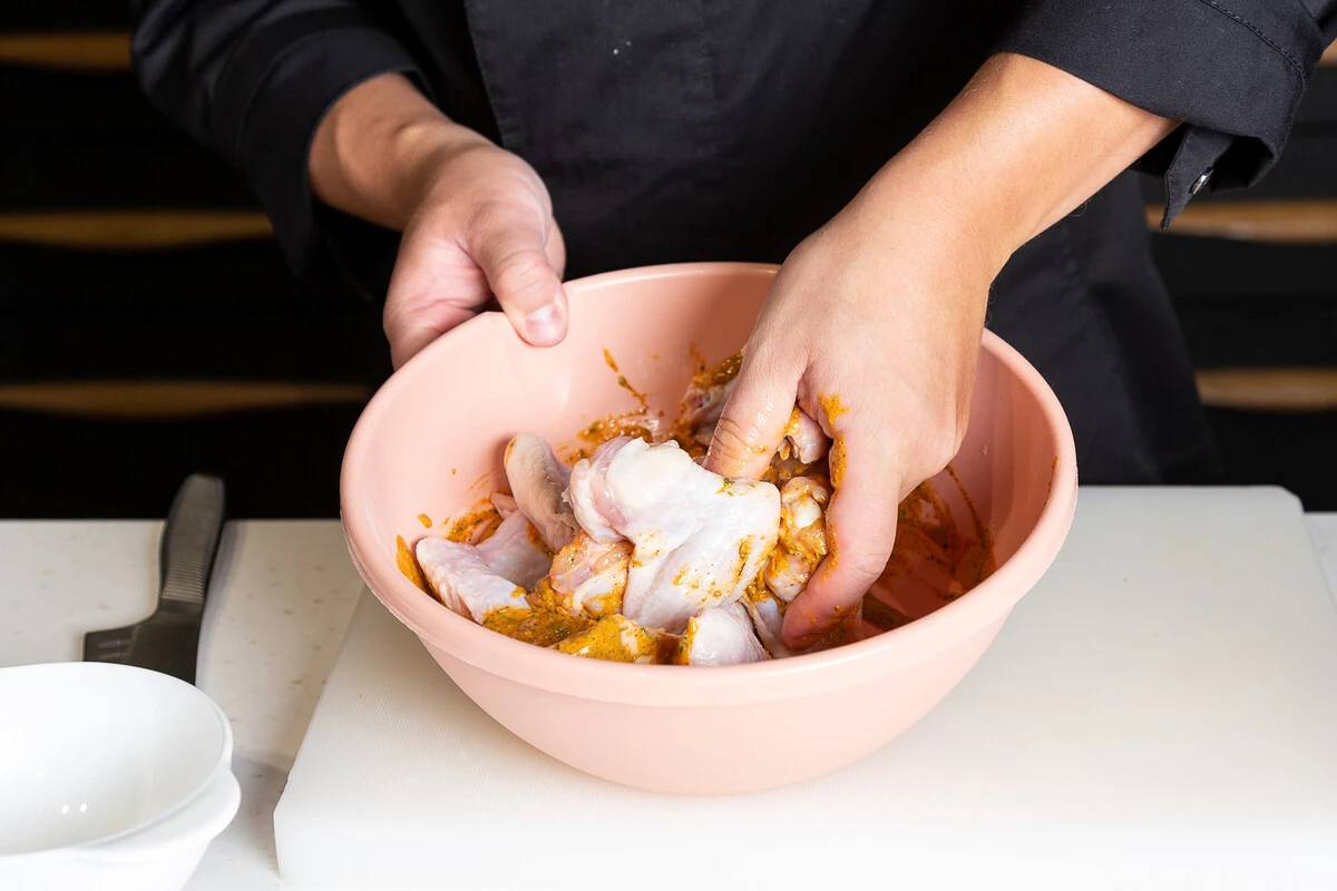 Выложите в получившийся маринад крылья, хорошо перемешайте и оставьте мариноваться на 12 часов.