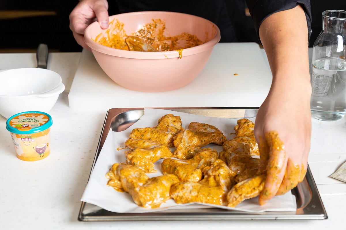 Когда крылышки промаринуются, застелите противень бумагой для запекания. Выложите крылышки и запекайте в разогретой до 180 ℃ духовке 15 минут.