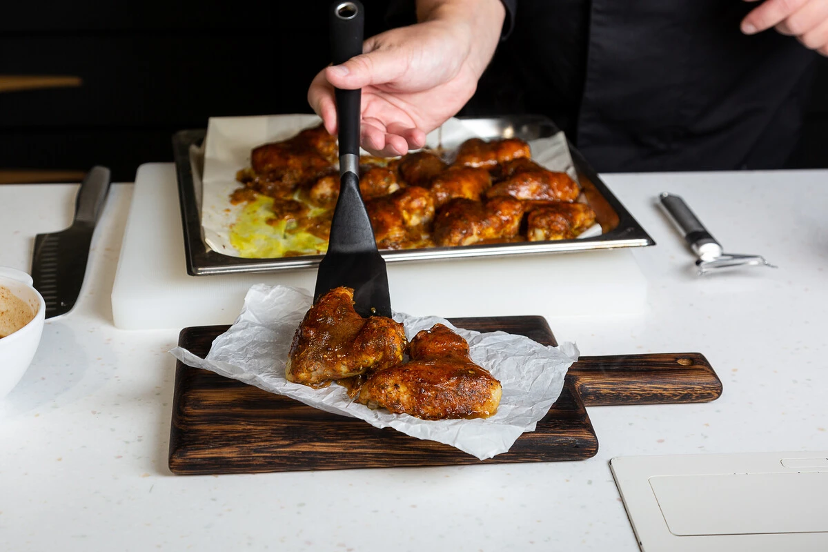 Наверняка вы пробовали куриные крылышки в маринаде с мёдом. А как насчёт маринада и глазури с мороженым? Мы взяли сорбет манго-маракуйя — этот тропический микс отлично сочетается с курицей, и, между прочим, он менее калорийный, чем мёд. Крылышки получаются очень вкусными и сочными, попробуйте!