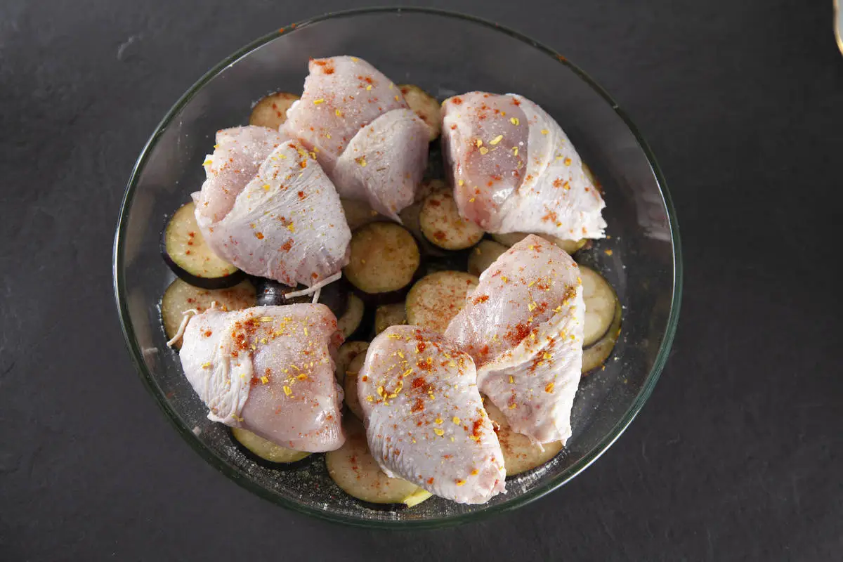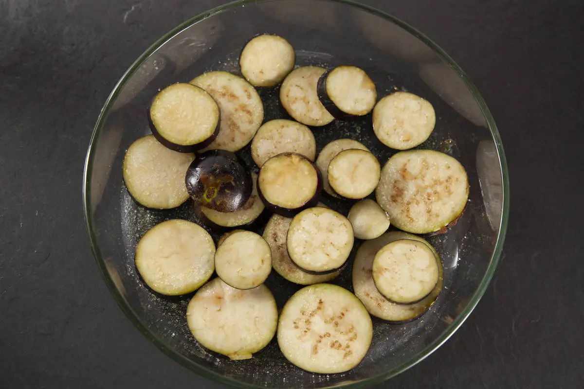 С баклажанов слейте выделившийся сок, разложите кружочки на дно формы для запекания.