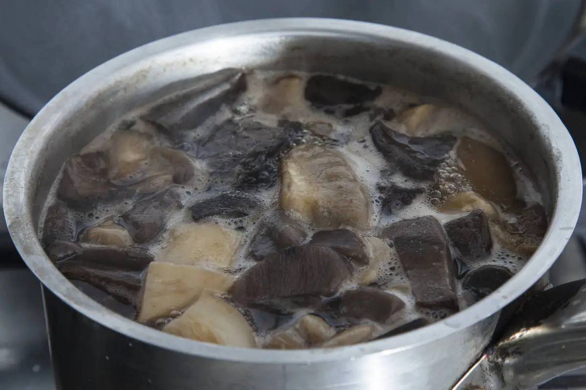 Грибы отварите в небольшом количестве кипящей воды 10-15 минут (лисички можно не варить), откиньте на дуршлаг и нарежьте некрупными кусочками.