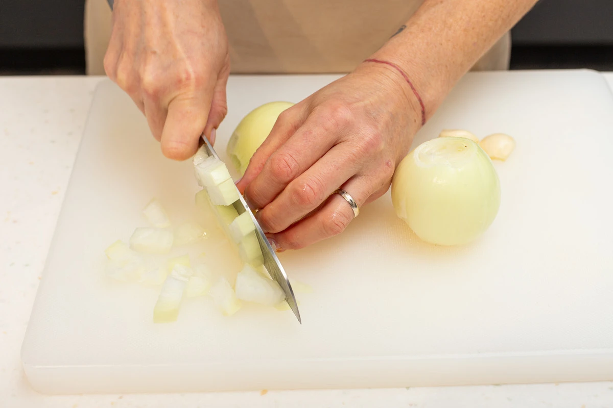 Лук помойте, почистите и нарежьте крупно. Чеснок нарежьте крупно.