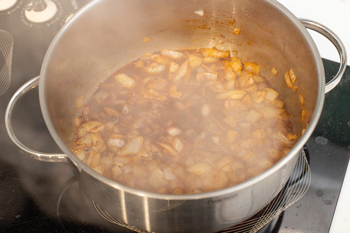 Разогрейте кастрюлю с 2 ст. ложками растительного масла и выложите в неё лук и чеснок. Добавьте молотую паприку, кориандр, зиру, посолите, поперчите. Перемешайте.