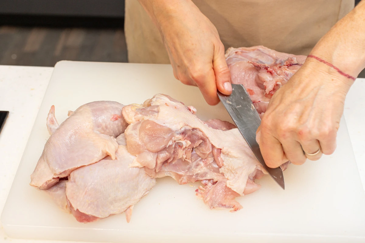 Курицу помойте в холодной воде и разделайте: отрежьте крылья, разрежьте их по фалангам, отрежьте голени, бёдрышки, снимите филе с костей и нарежьте крупно. Кожу можно выбросить, а из костей сварить бульон.