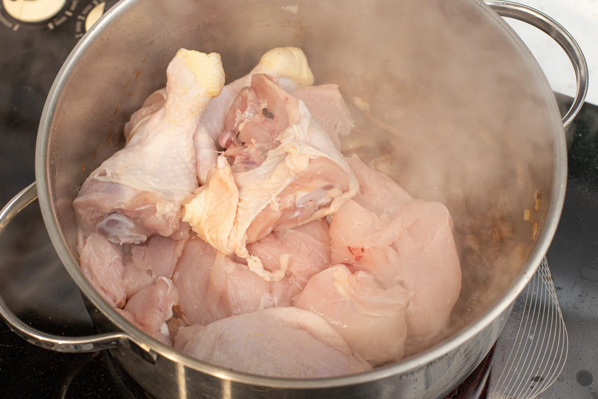 Выложите курицу в кастрюлю, залейте водой так, чтобы она покрывала ингредиенты. Добавьте 2 ст. ложки наршараба и перемешайте.