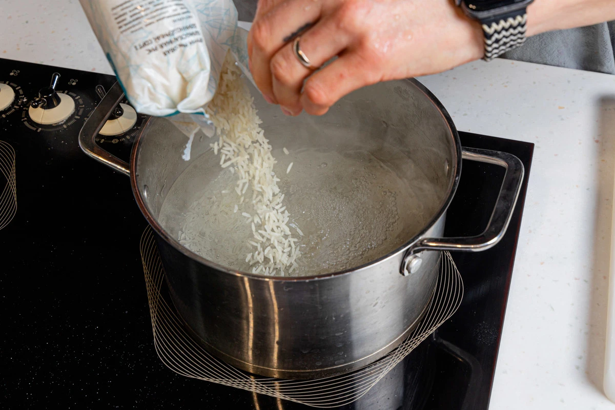 Поставьте вариться рис. Для этого вскипятите воду в большой кастрюле, посолите из расчёта 0,5 ч. ложки соли на 1 л воды, засыпьте 200 г сухого риса и варите 20 минут.