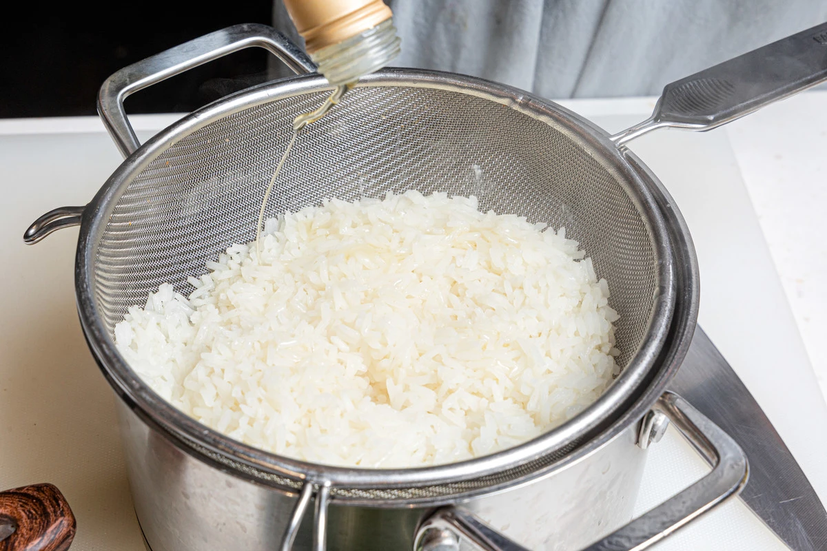 По окончании варки крупу откиньте на дуршлаг, чтобы стекла вода. Затем добавьте в ещё горячий рис 1-1,5 ч. ложки кунжутного масла, перемешайте.