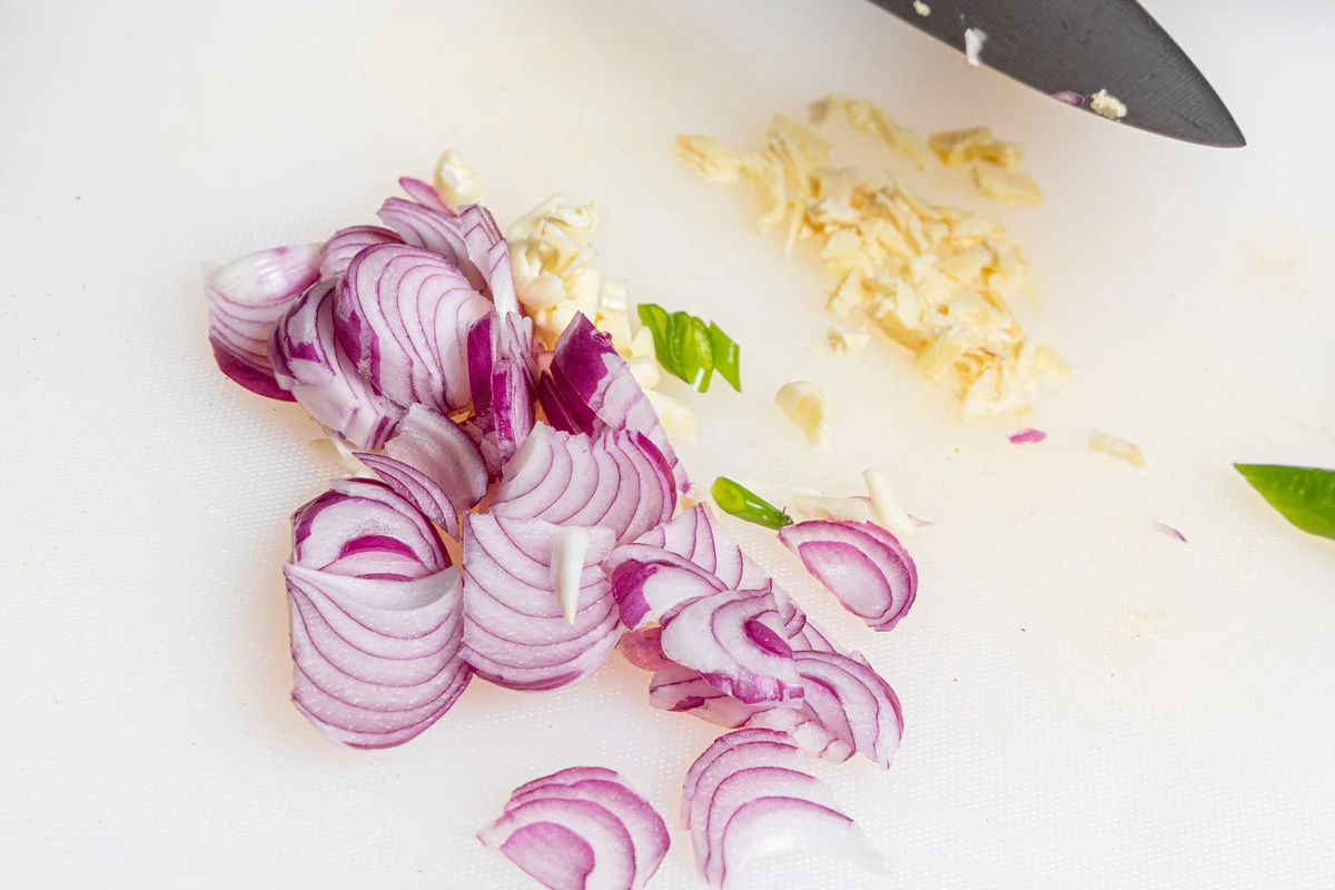 Лук нарежьте перьями. Корень имбиря и чеснок почистите и нарежьте мелко. Чили очистите от семян и также нарежьте мелко.