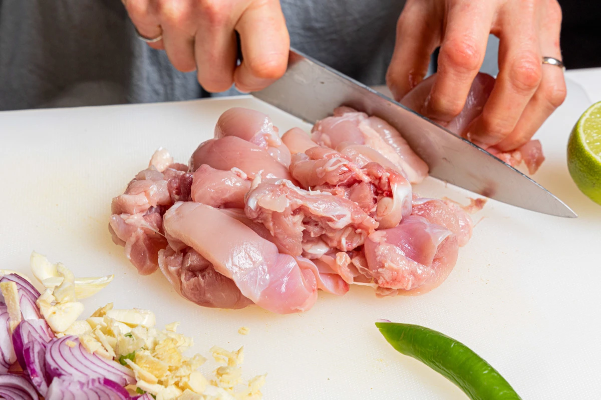 В мисочку налейте 2 ст. ложки холодной воды, добавьте 1 ч. ложку крахмала и смешайте до однородности. Кинзу мелко нарежьте. Добавьте разведённый крахмал и кинзу в курицу, перемешайте и готовьте всё вместе ещё 5 минут.