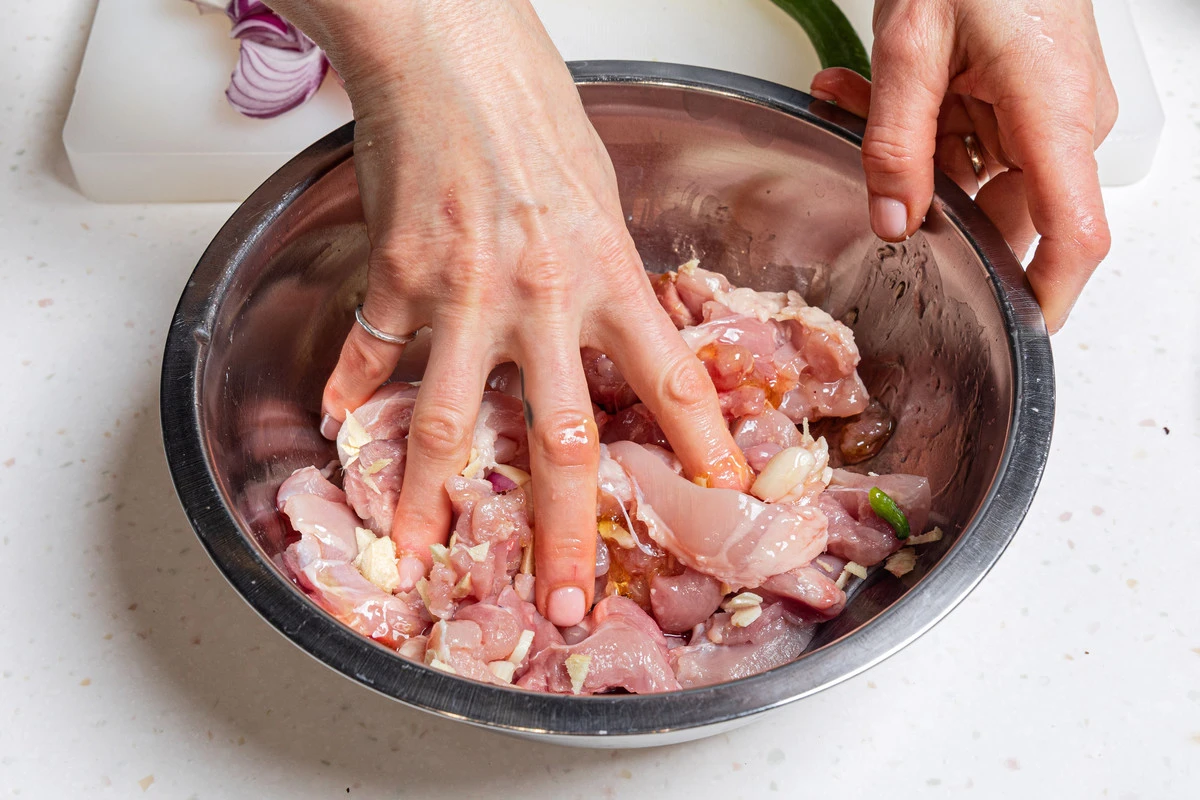 Выложите птицу в подготовленный маринад, добавьте лук, перемешайте и оставьте на 25-30 минут.