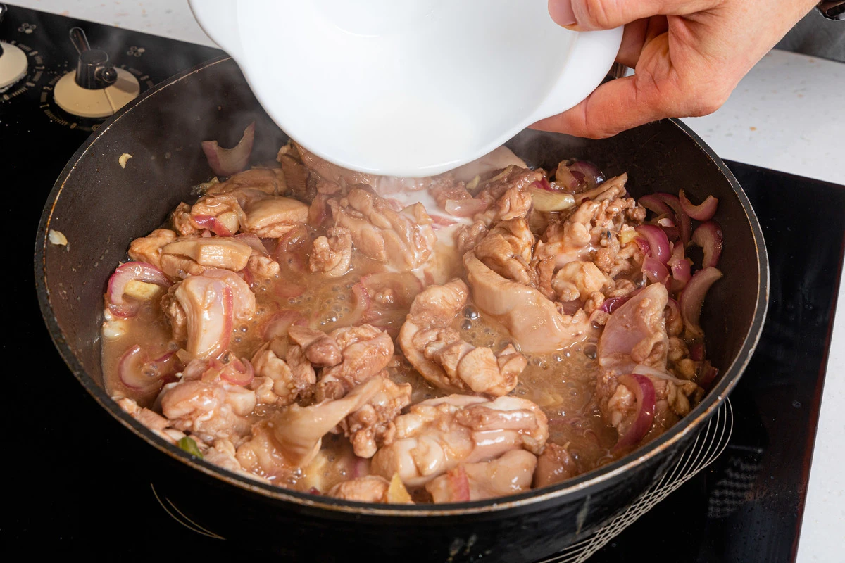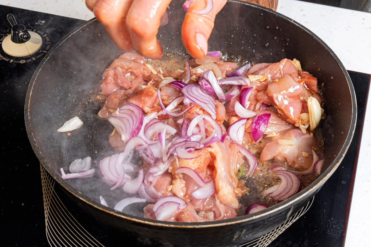 Разогрейте сковороду с 1 ст. ложкой кунжутного или другого растительного масла. Выложите курицу с луком и готовьте 10-15 минут, периодически помешивая.