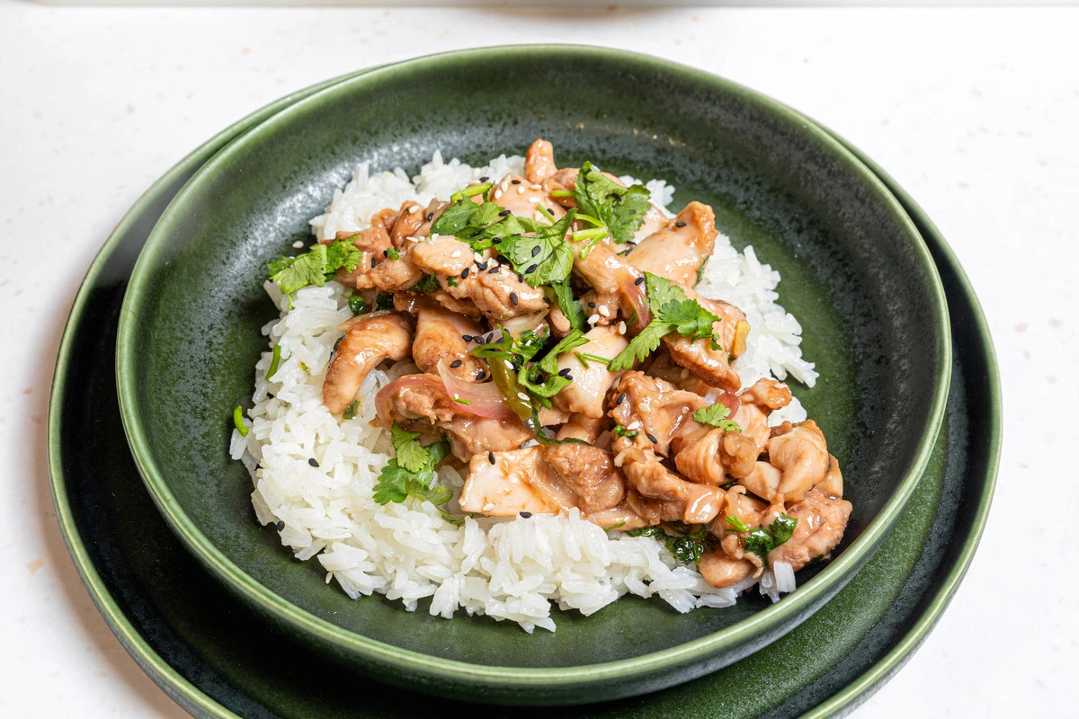 Разложите рис по тарелкам, сверху — курицу. Посыпьте мелко нарезанной свежей кинзой и кунжутом.