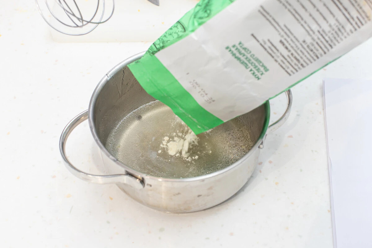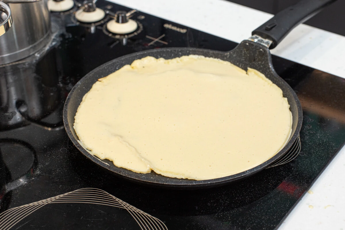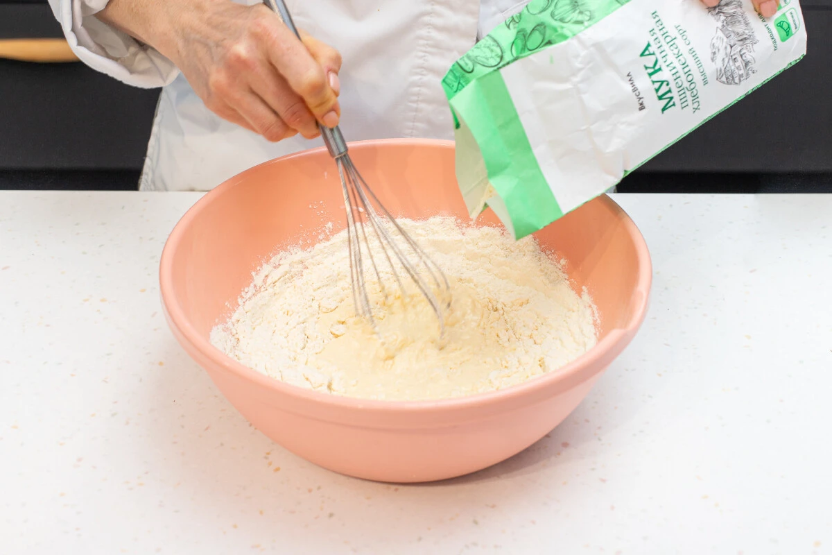 Вмешайте всю муку для блинов венчиком так, чтобы не было комочков. Продолжая помешивать, налейте оставшееся молоко. Добавьте соль, сахар и оставьте на 20-30 минут.