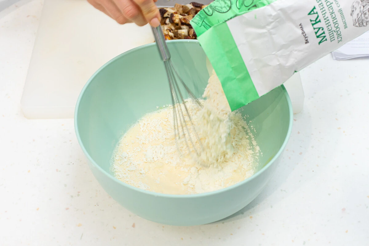 Если используете замороженные грибы, заранее разморозьте их. Достаньте сливочное масло для теста из холодильника за пару часов до приготовления, чтобы оно размягчилось. Замесите тесто. Для этого положите масло в миску. Слегка взбейте яйца для теста вилкой. Добавьте яйца к маслу и перемешайте венчиком. Добавьте молоко и сметану и ещё раз перемешайте.