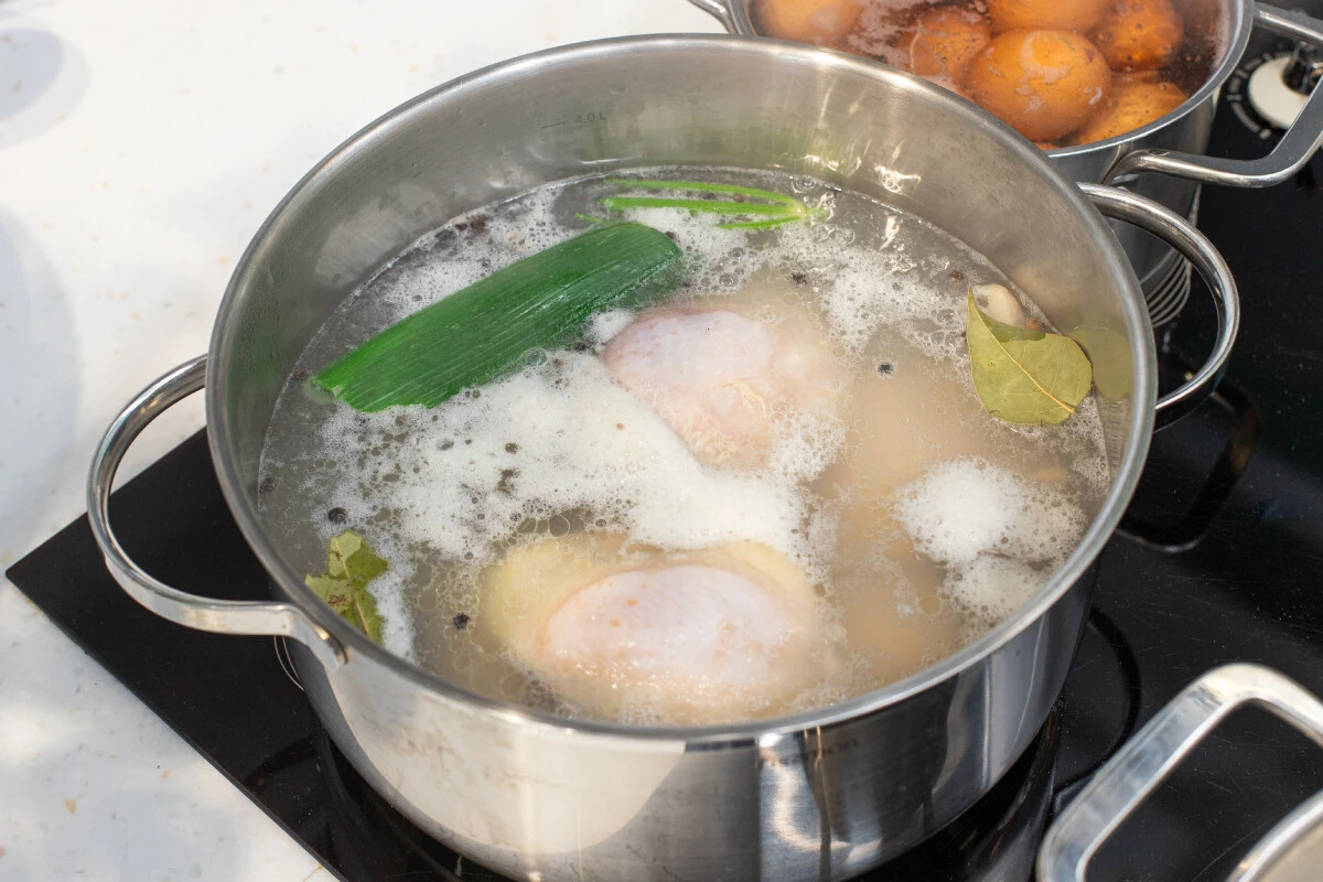 Отварите куриные бёдра с добавлением лаврового листа, чёрного перца горошком и любимых кореньев (морковь, репчатый лук, порей, стебли сельдерея и т.п.). Остудите.
