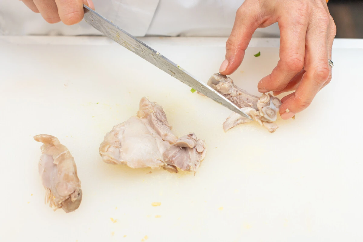 Бульон процедите и сохраните. Мясо отделите от костей и мелко нарежьте.