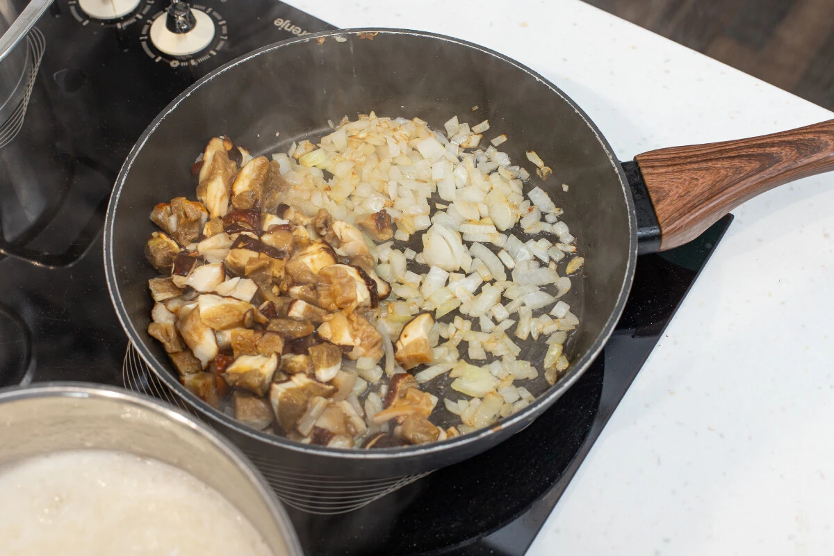 Репчатый лук почистите. Нарежьте грибы и лук кусочками среднего размера. Пожарьте грибы с луком, помешивая при необходимости, пока не выпарится жидкость. Добавьте сливочное масло и готовьте, пока смесь не начнёт карамелизироваться и не станет золотистого цвета. Остудите.
