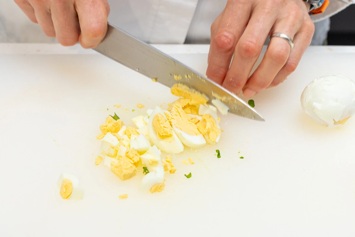Яйца отварите вкрутую и крупно порубите. Остудите.