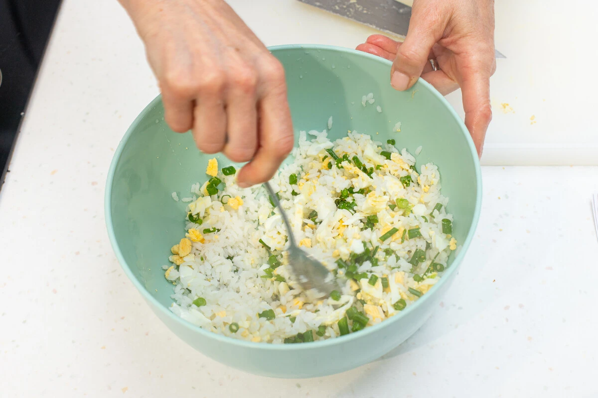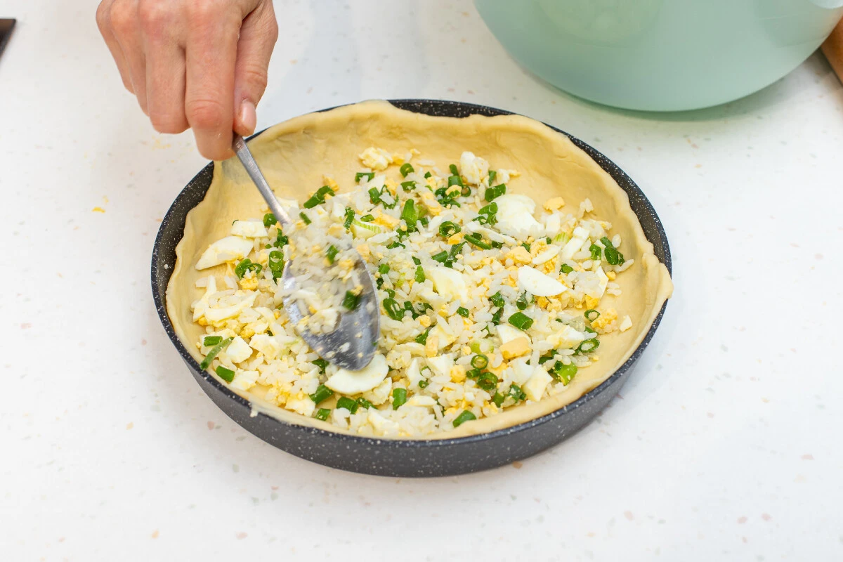 Зелёный лук мелко порубите. Смешайте с яйцами и можно также смешать с рисом, как это сделали мы. Все начинки немного подсолите – меньше, чем если бы вы солили готовое блюдо. Если собирать пирог будете не сразу, разложите начинки по контейнерам.