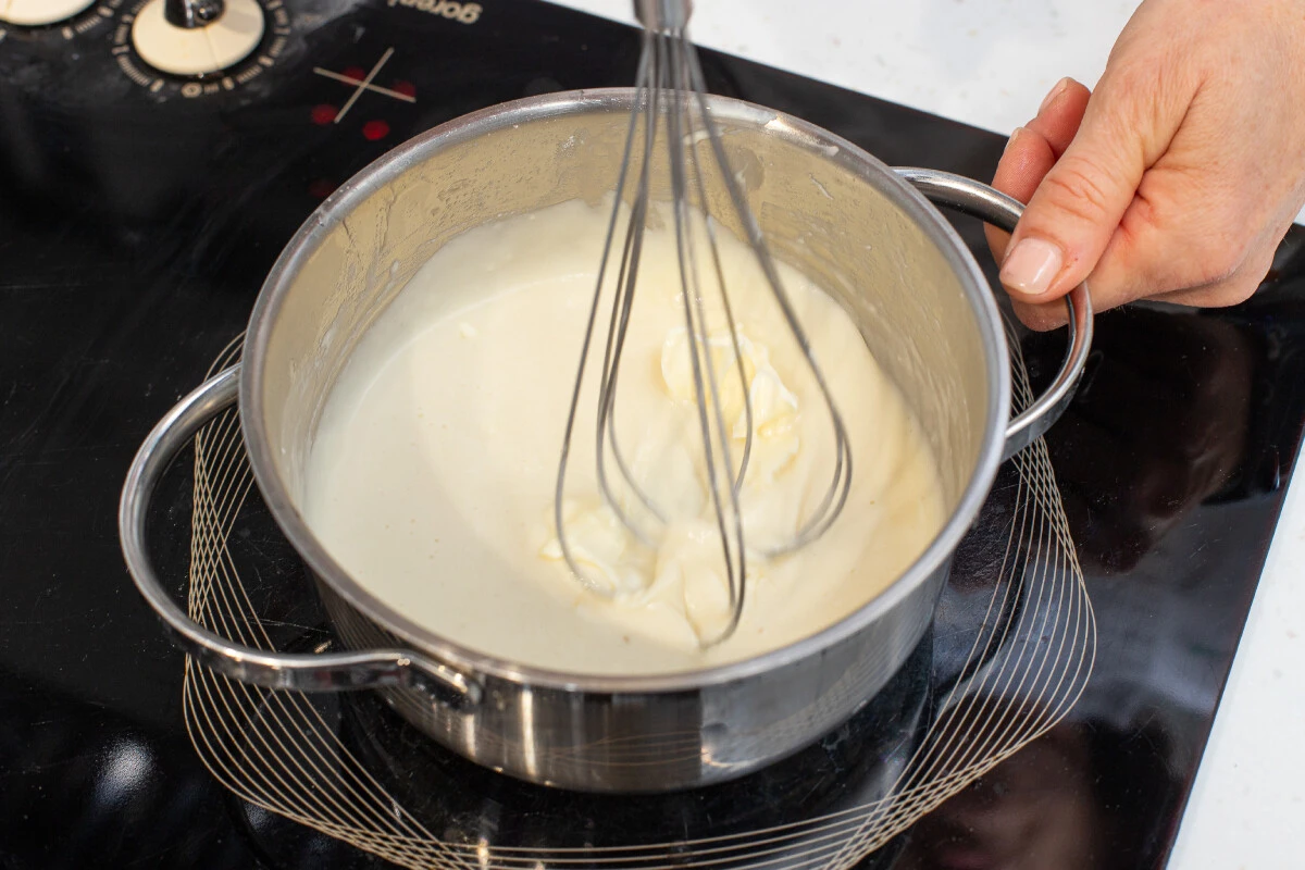 Подогрейте, постоянно помешивая венчиком, до получения однородной массы. В конце вмешайте сметану или сливки. Посолите и поперчите по вкусу.