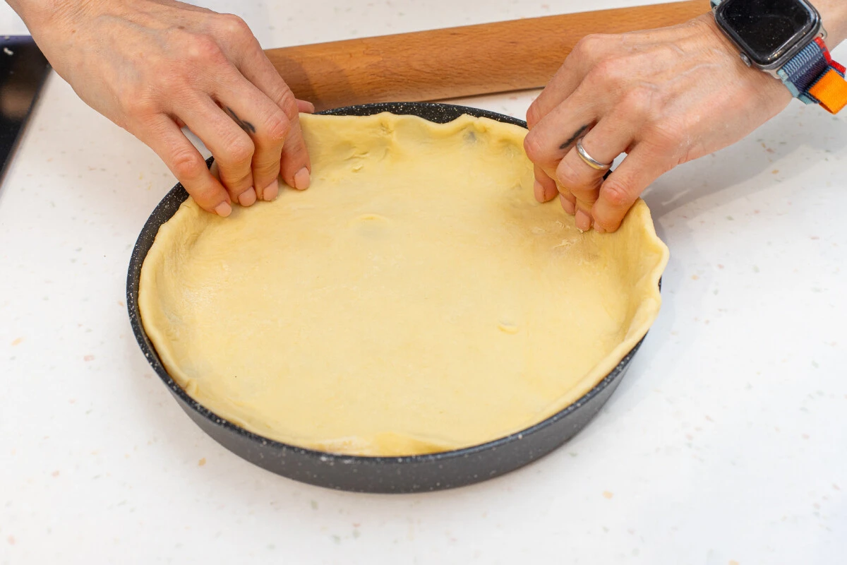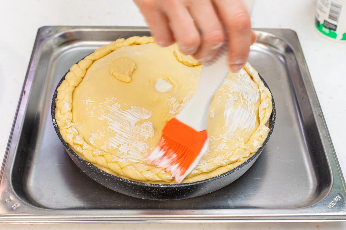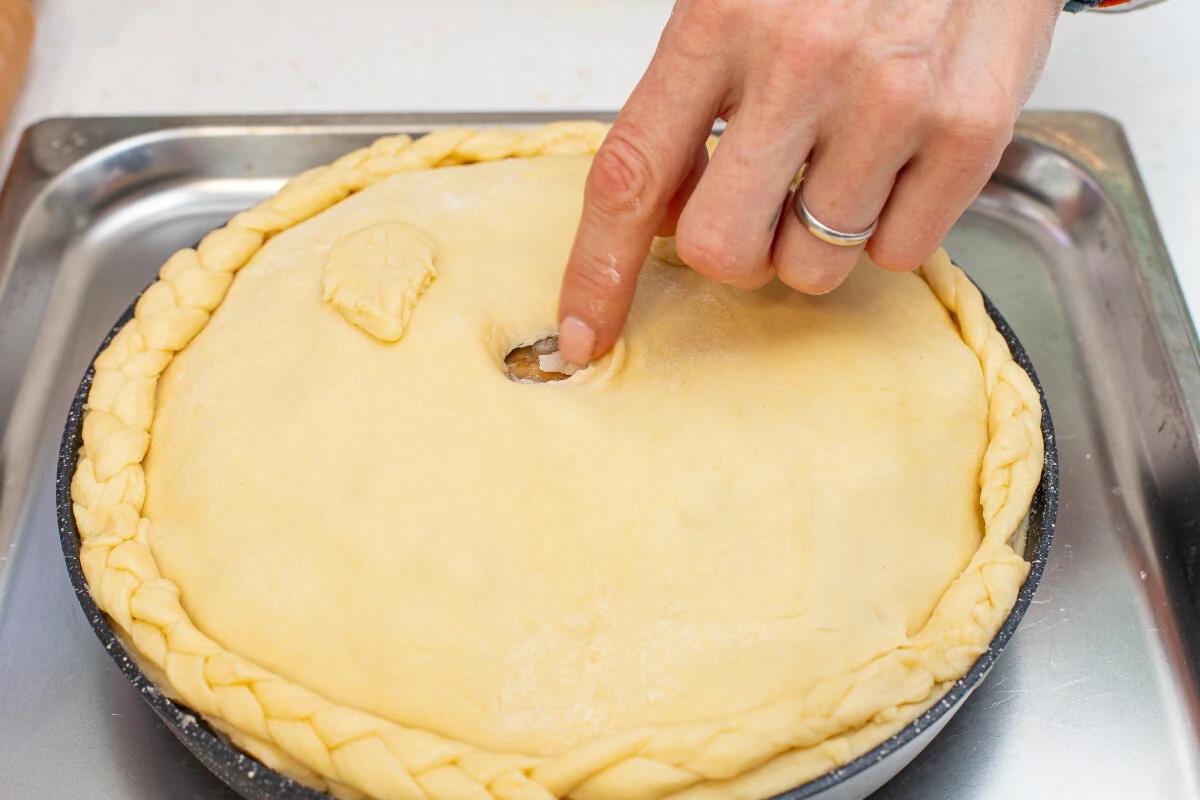 Накройте пирог крышечкой из теста и хорошо залепите. В центре сделайте отверстие, через которое будет выходить пар при приготовлении, чтобы пирог не потрескался.