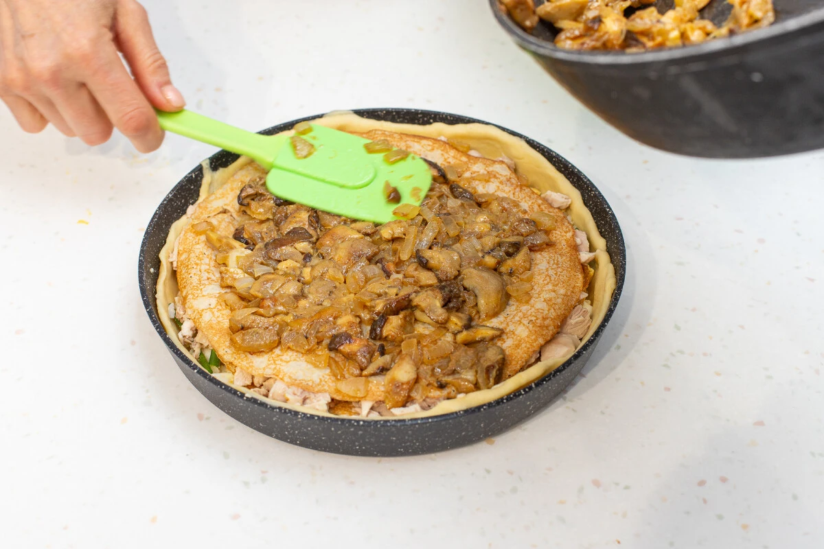 Далее – 1/3 грибной начинки, сверху – блинчик. Чередуйте так ещё 3 раза, или пока начинка не закончится.