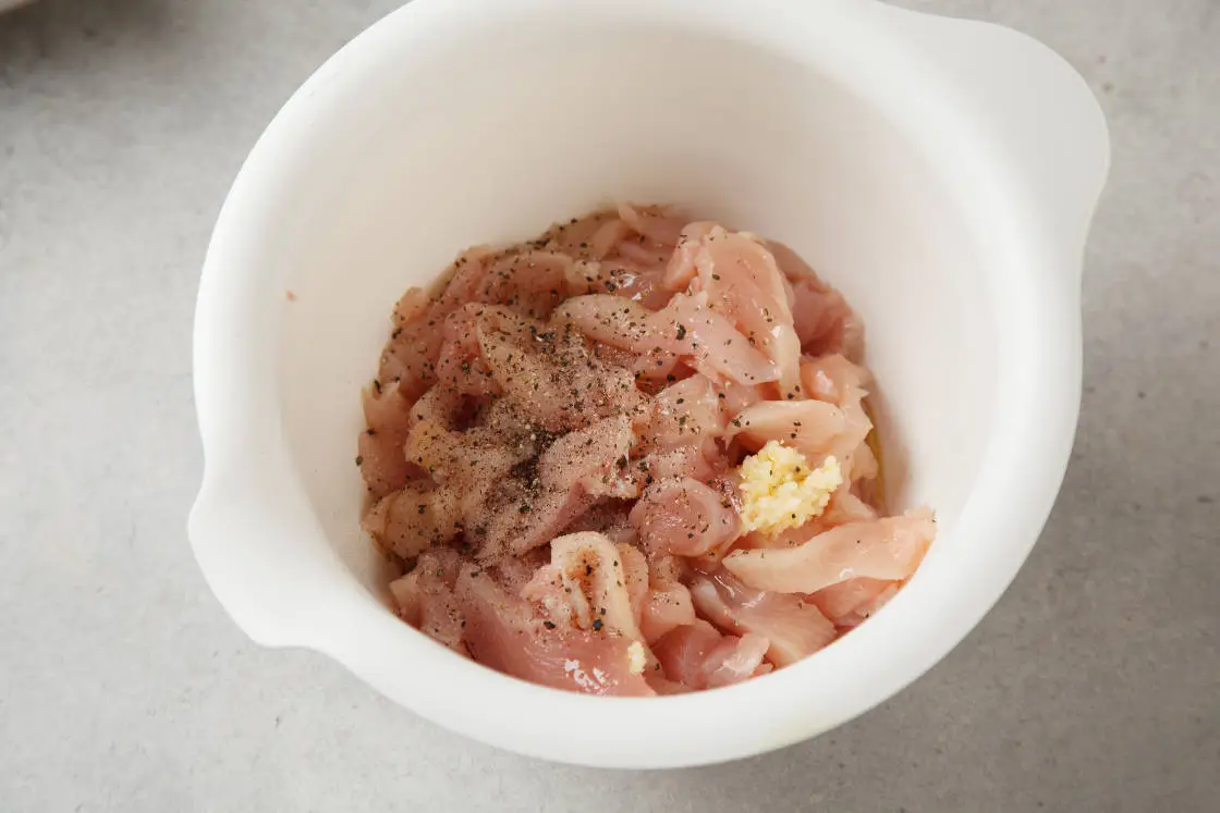 Куриное филе нарежьте тонкими полосками, посолите, поперчите, добавьте пропущенный через пресс чеснок и перемешайте. Оставьте на 10 минут.