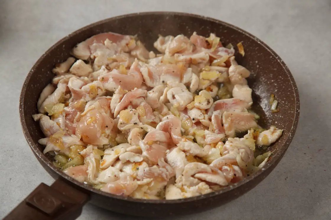 Растопите сливочное масло и обжарьте до прозрачности нашинкованный кубиками лук. Добавьте куриное мясо, обжаривайте на среднем огне около 5 минут.
