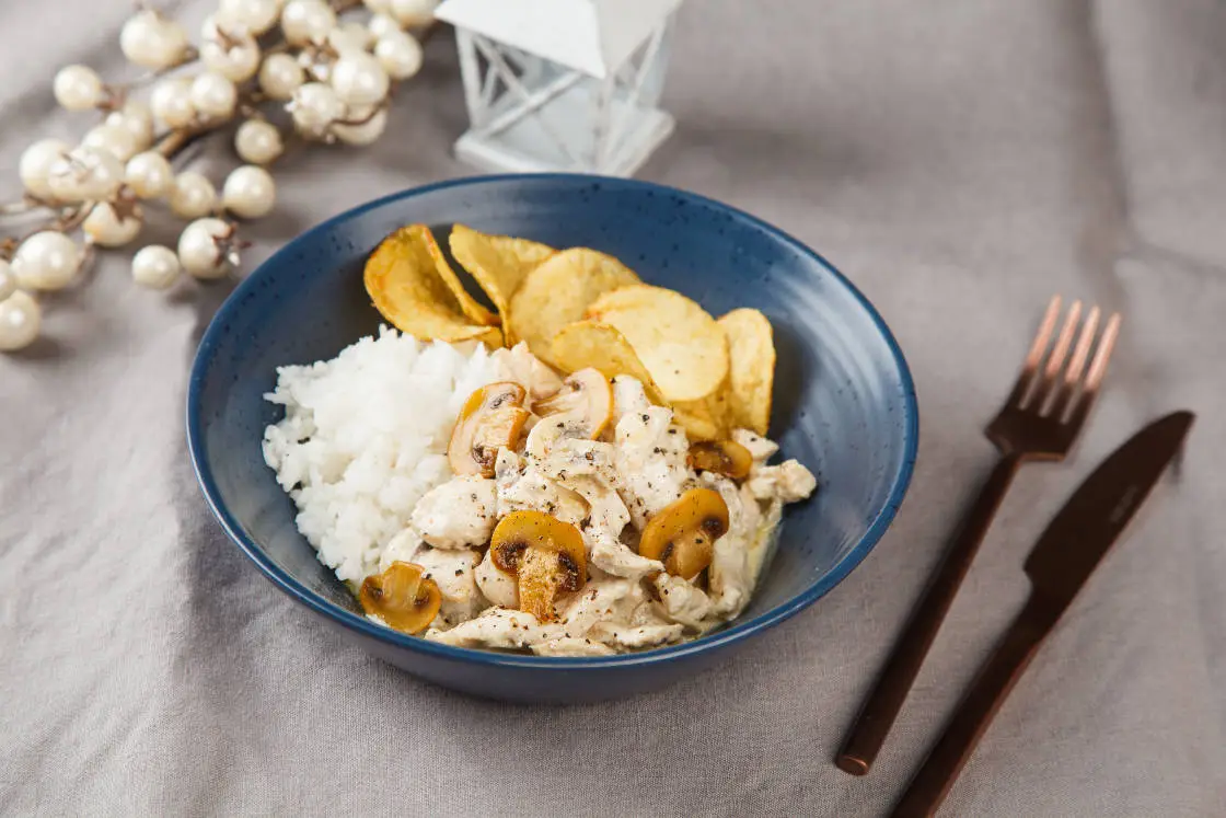 Подавайте нежный курстроганофф с отварным рисом и картофельными чипсами.