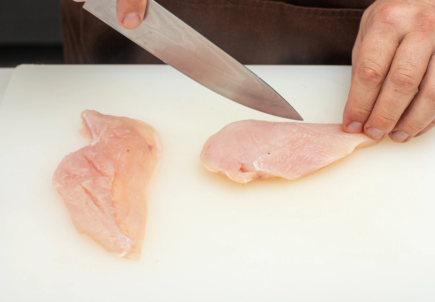 Сделайте на куриной грудке несколько неглубоких поперечных и продольных надрезов: так она лучше промаринуется и приготовится равномернее.