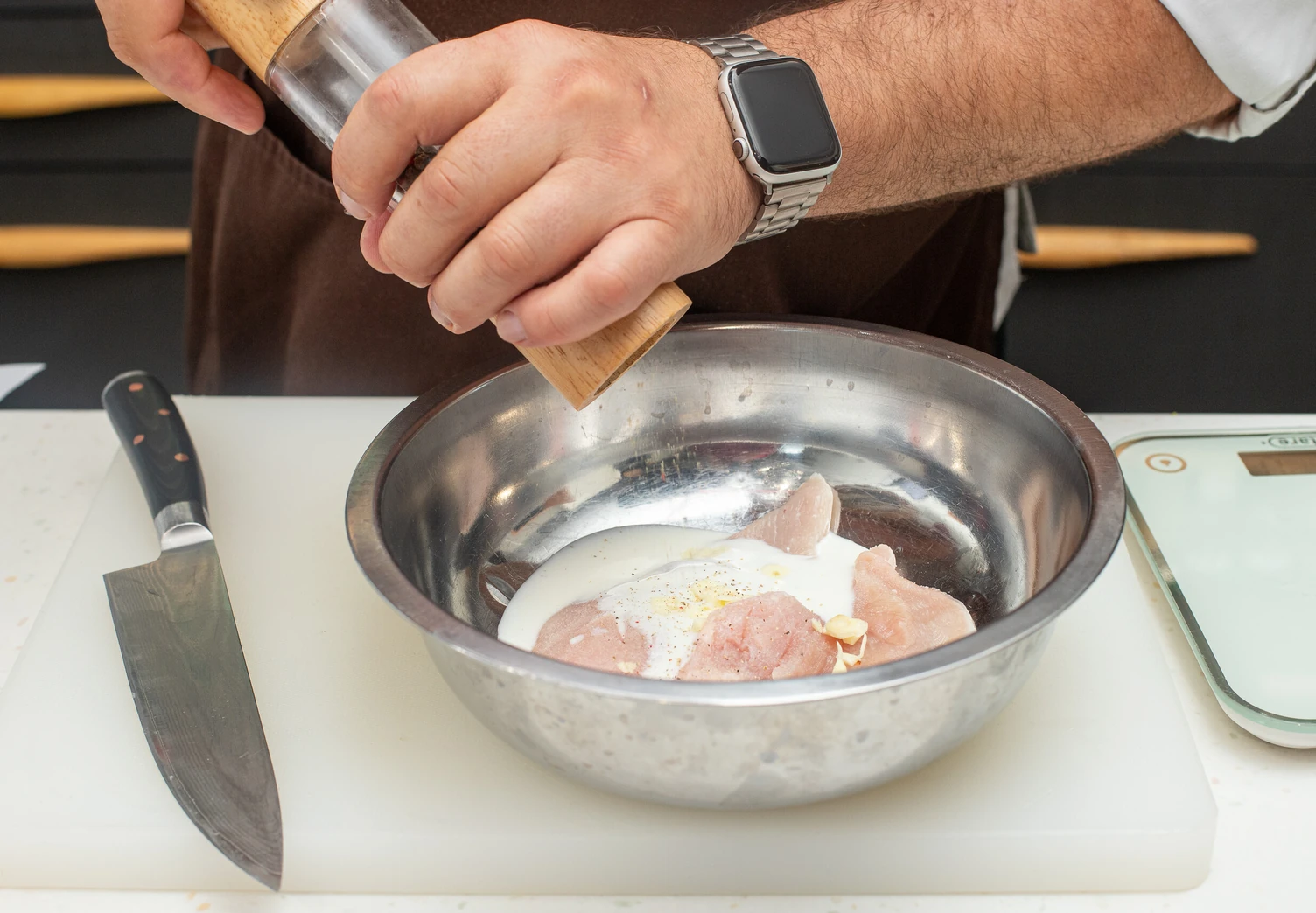 Главный секрет этого рецепта — маринад на основе натурального йогурта. Он не только смягчает куриную грудку, делая её буквально тающей во рту, но и придаёт мясу тонкие свежие нотки. И всё это — без лишних калорий и жира.