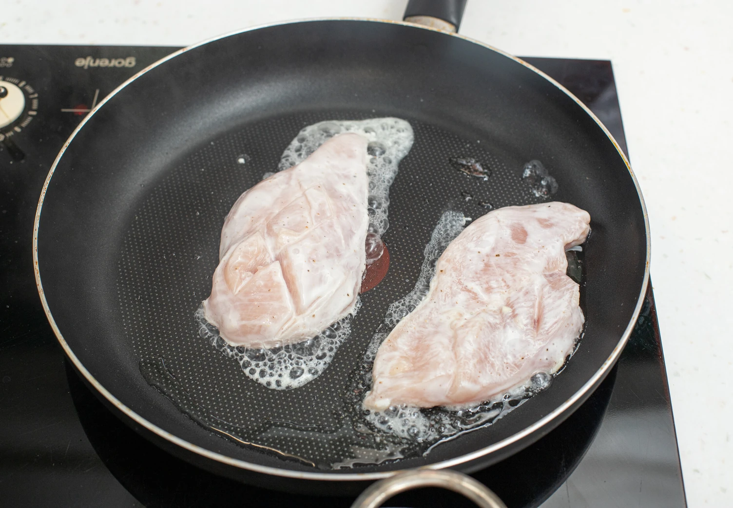 Обжарьте куриную грудку на растительном масле с двух сторон до золотистого цвета или запеките в духовке, разогретой до 200 градусов, в течение 20-25 минут.