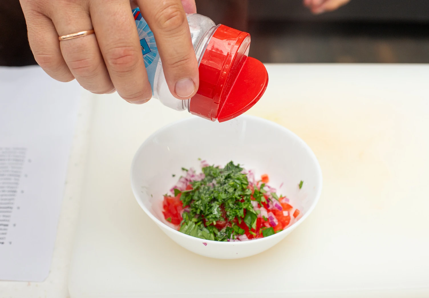 Для соуса сальса мелко порубите помидоры и лук. Смешайте с оливковым маслом, посолите и поперчите по вкусу. По желанию можно добавить сок лайма или немного бальзамического уксуса.