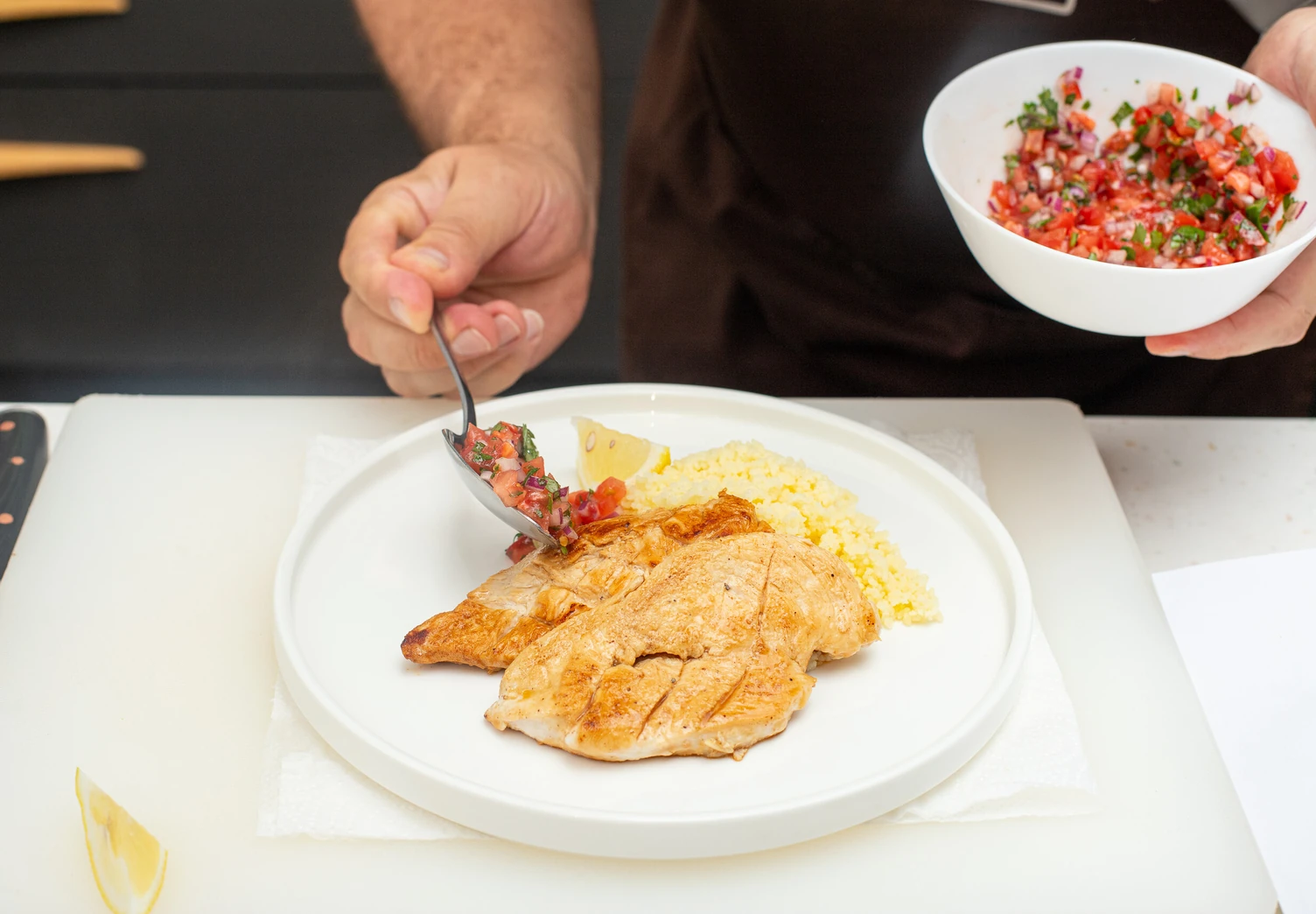 Подавайте кусочки курицы с кускусом, сальсой и долькой лимона.