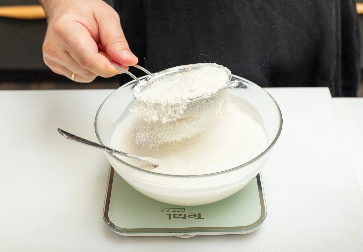 В миске смешайте тёплый кефир и соду и оставьте на 5 минут. Затем добавьте сметану, соль и перемешайте до однородности.