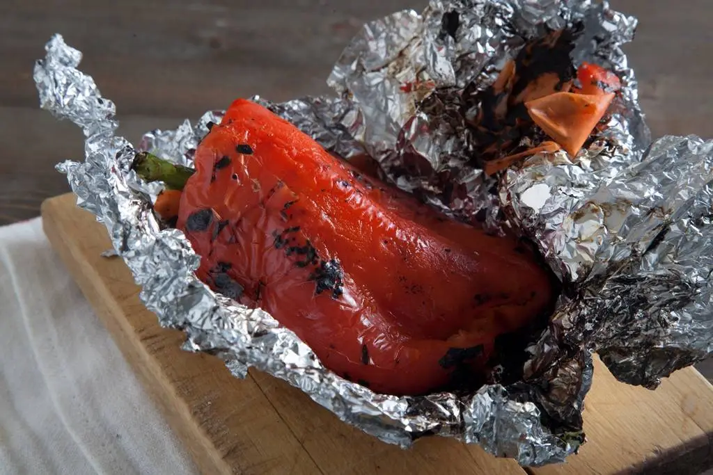 Болгарский перец подпеките со всех сторон до черных подпалин — это можно сделать в максимально разогретой духовке под грилем или прямо на огне конфорки, затем быстро уберите в пакет (лучше использовать небольшой плотный бумажный) или небольшой, плотно закрывающийся контейнер.