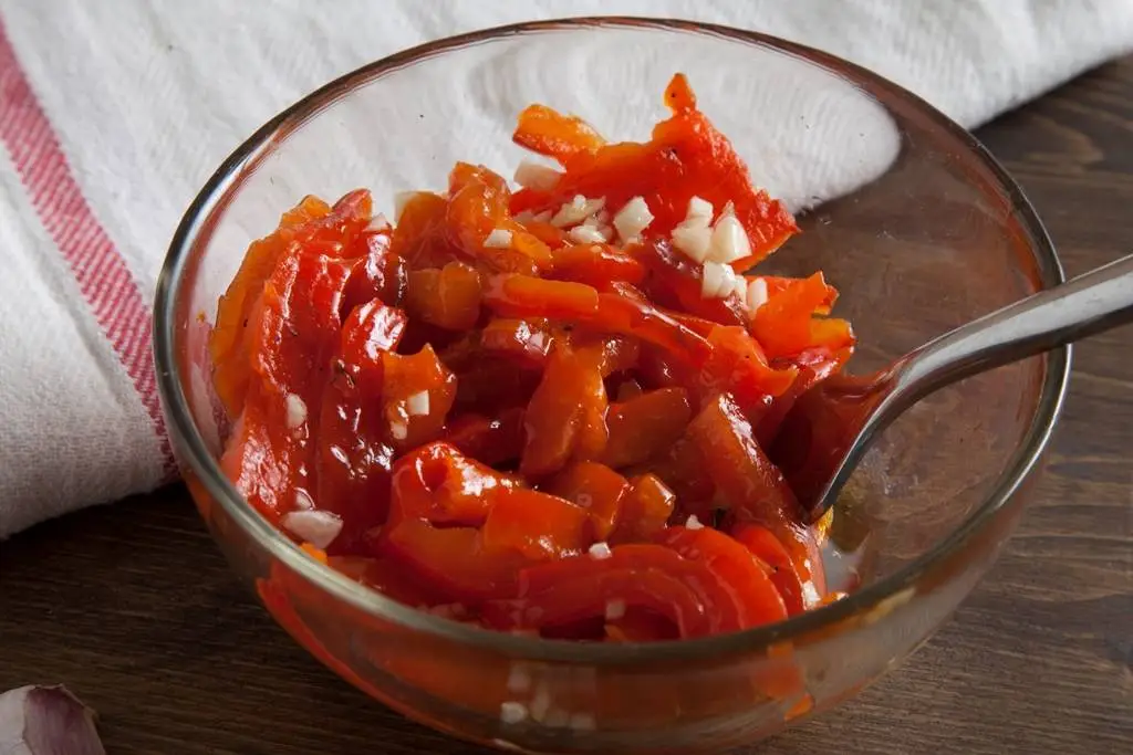 Когда перец слегка остынет, снимите кожицу, нарежьте мякоть полосками, посолите, поперчите и смешайте с оливковым маслом, рубленым чесноком и петрушкой.