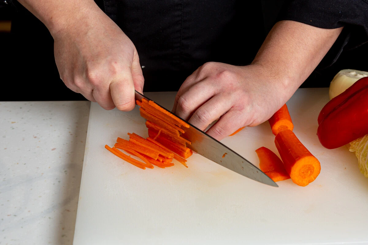Нарежьте лук, морковь и болгарский перец тонкой соломкой.
