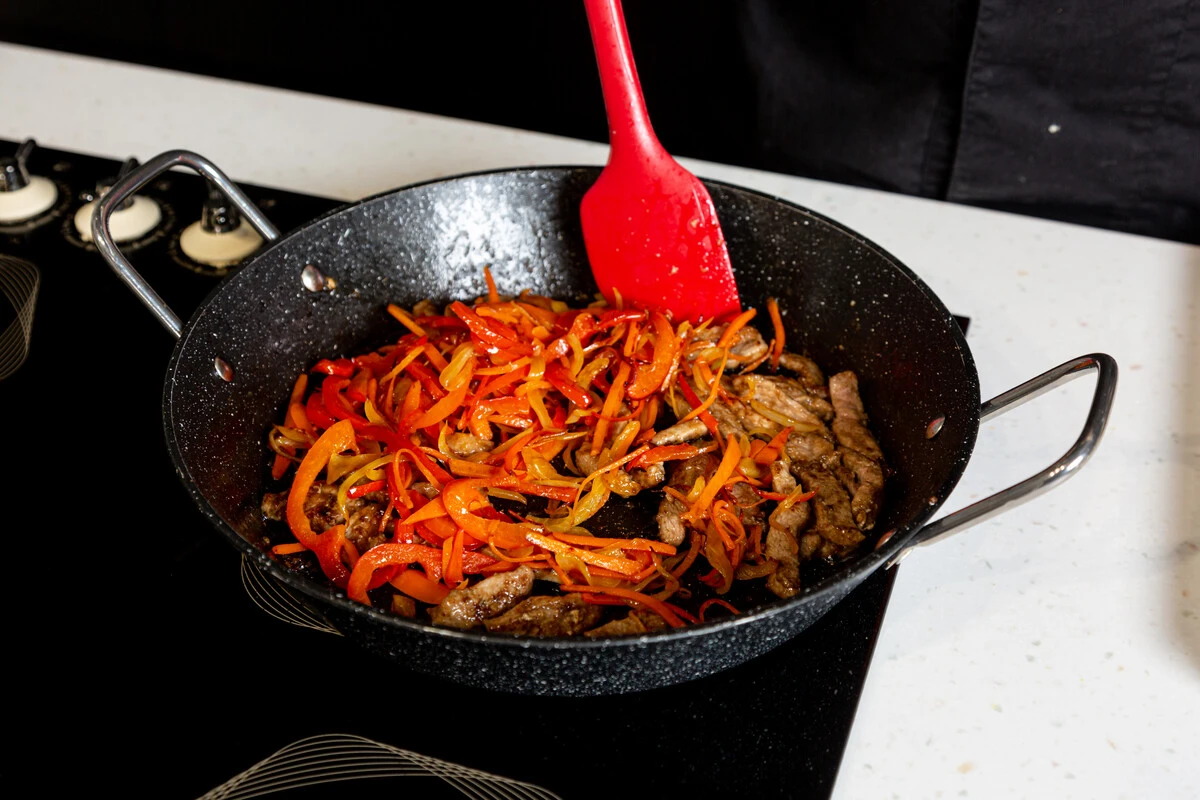 Разогрейте на сковороде растительное масло и на сильном огне обжарьте овощи до корочки в течение 2 минут. Вытащите их из сковороды.