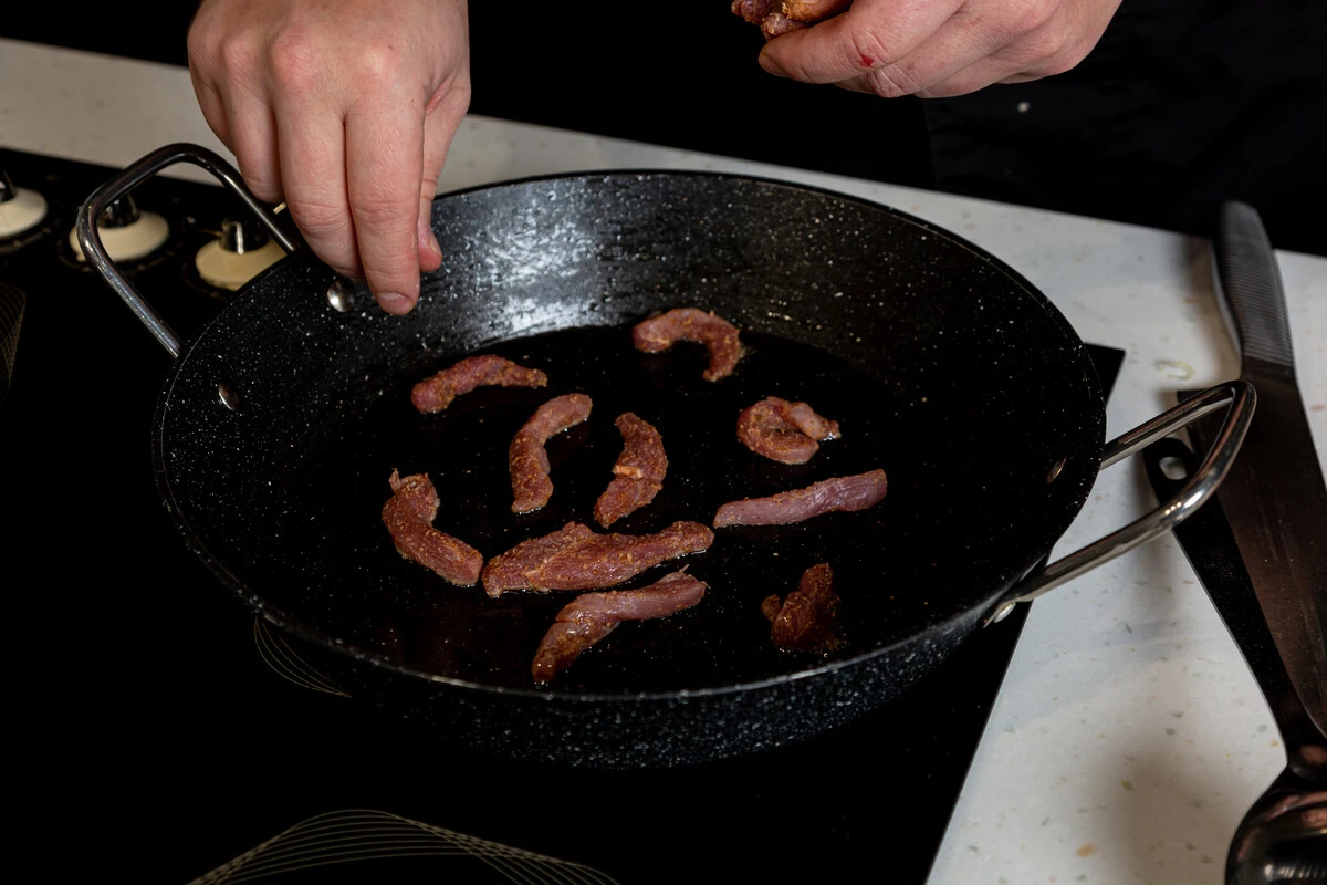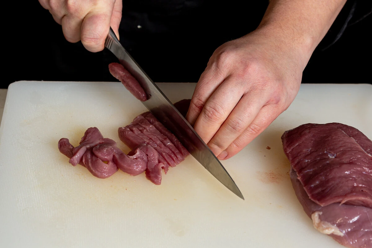 Удалите кожу у утиной грудки. Филе нарежьте соломкой.