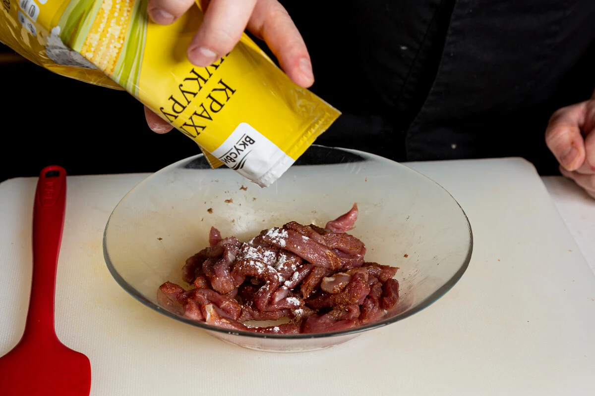 Обваляйте филе в специях, а затем — в кукурузном крахмале.