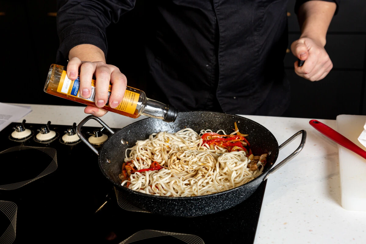 Соедините утку с овощами. Сверху выложите отваренную до состояния аль денте лапшу. Добавьте соевый соус, соус «Чили Сладкий» и перемешайте.