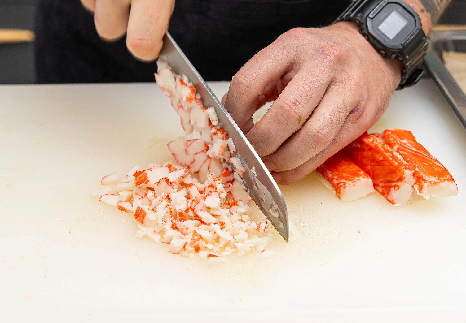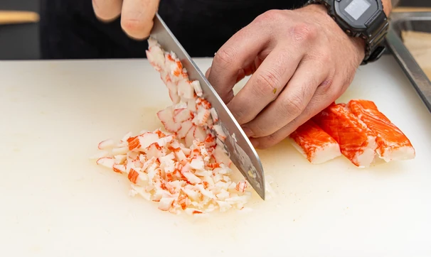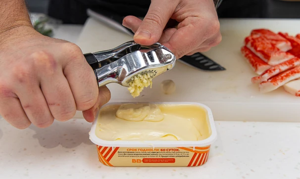 Сначала подготовьте начинку. Крабовые палочки мелко нарежьте. Чеснок очистите и натрите на мелкой тёрке или пропустите через пресс.