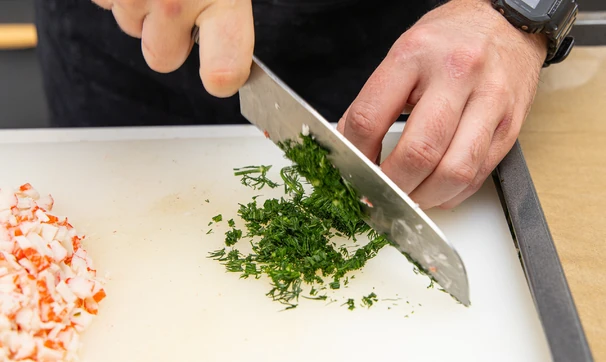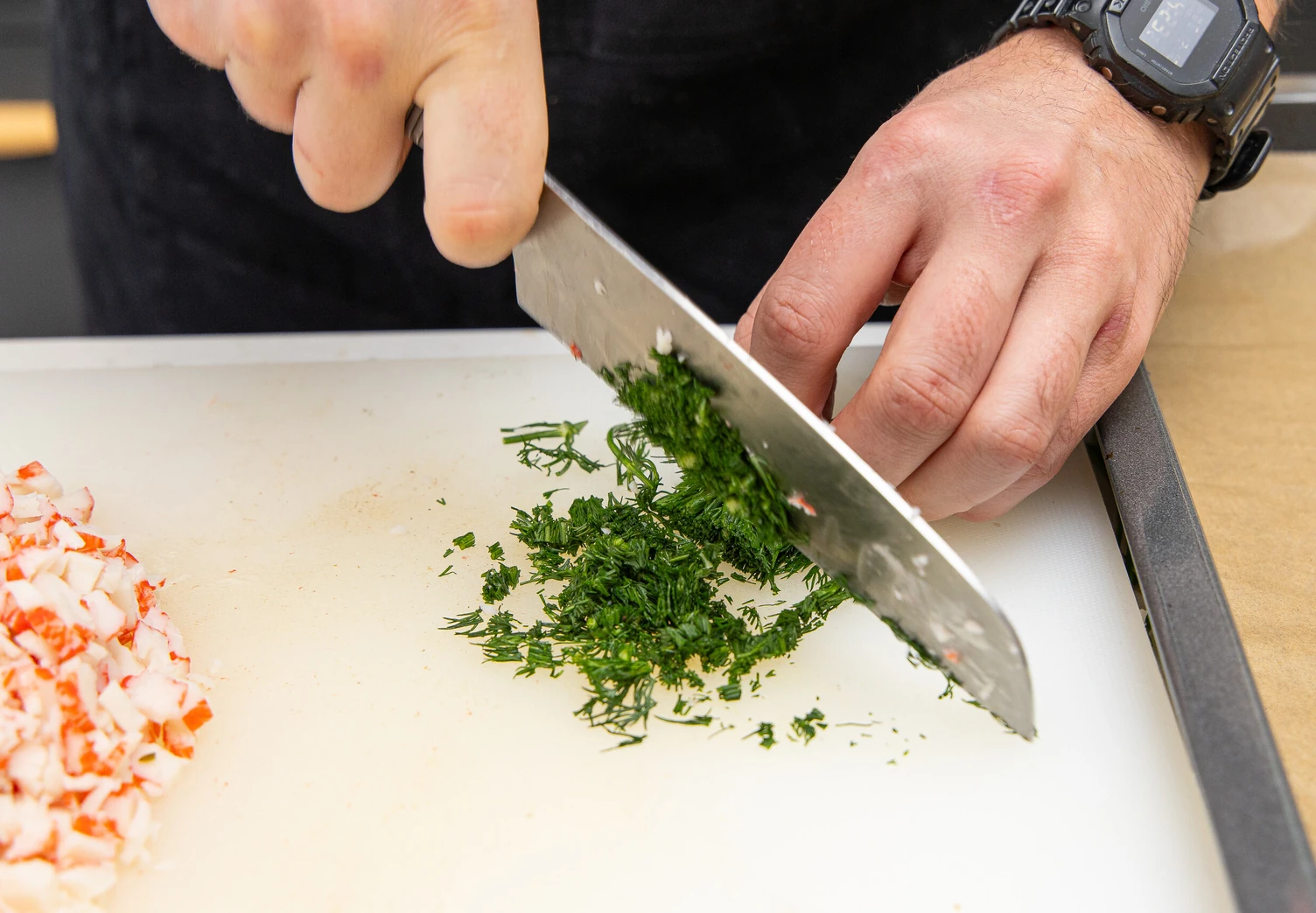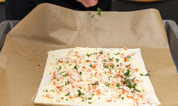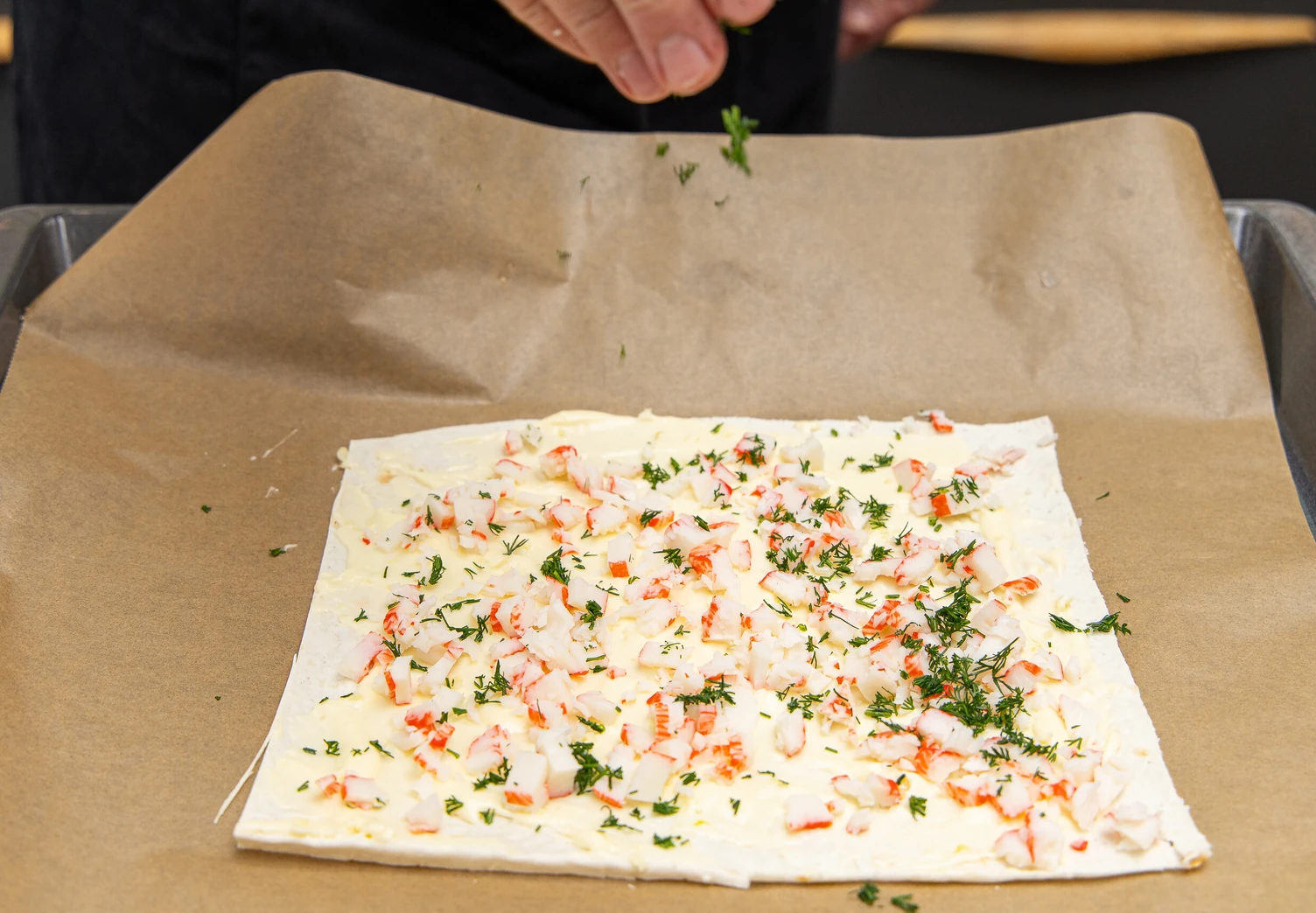 Теперь соберите основу. Лист лаваша разрежьте на 4 равных прямоугольника. Один из них равномерно намажьте сырной массой, посыпьте её нарезанным укропом, а затем — слоем крабовых палочек.