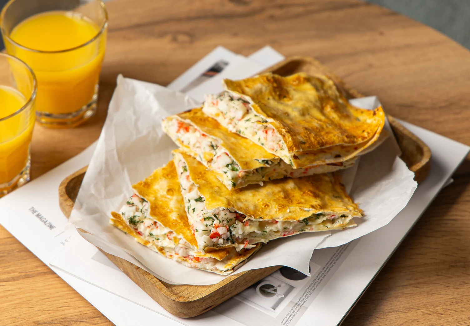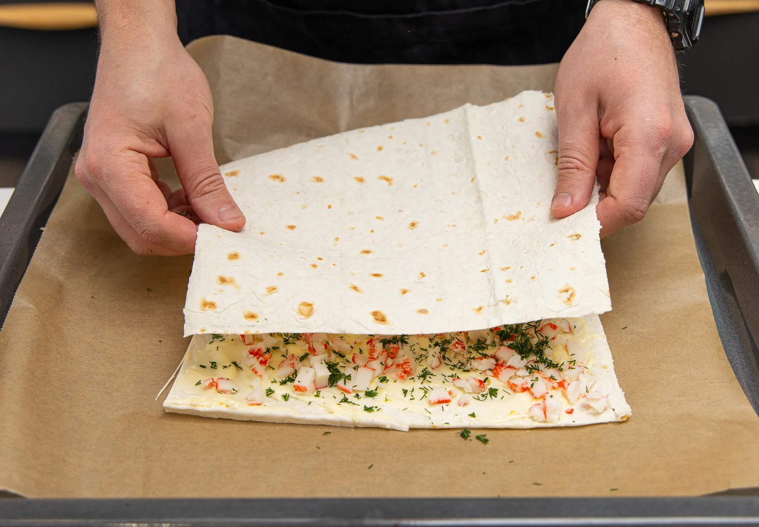Накройте эту начинку вторым листом лаваша и слегка прижмите его. Повторите слои (сыр — укроп — палочки) на этом втором листе и накройте третьим, по нему снова распределите начинку в том же порядке. Положите четвёртый лист лаваша сверху и хорошо прижмите всю стопку руками, чтобы она склеилась. Острым ножом аккуратно разрежьте получившуюся заготовку на небольшие прямоугольники или треугольники.