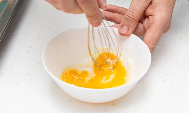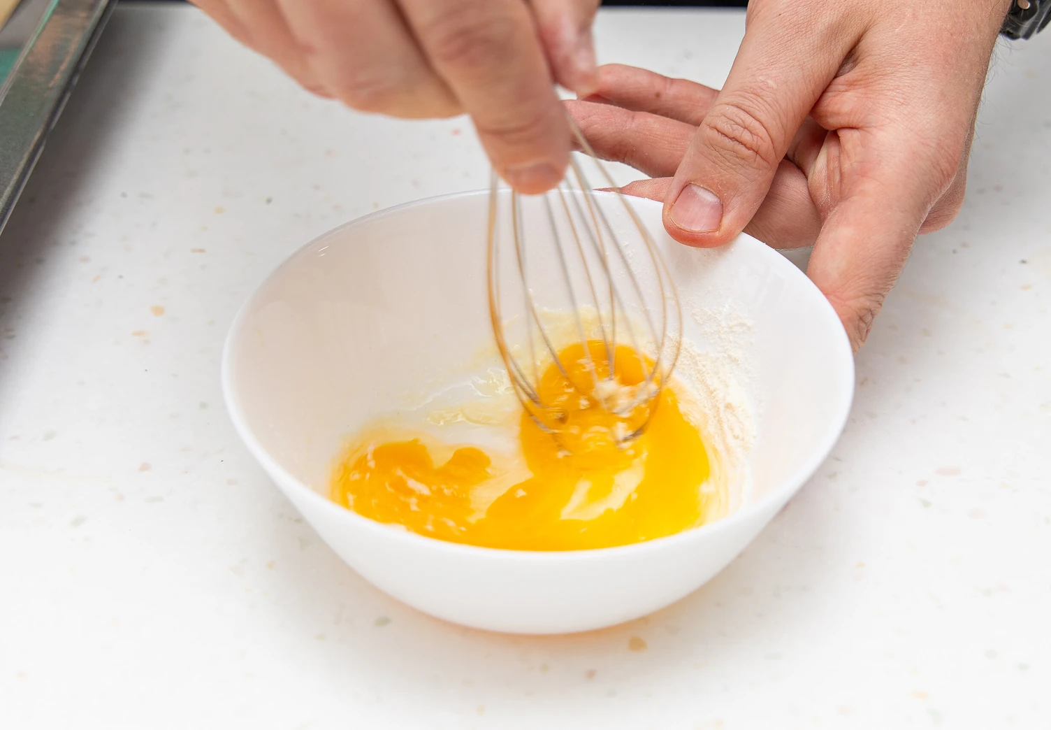 Приготовьте кляр. В миске слегка взбейте яйца вилкой, добавьте муку и перемешайте до получения однородной жидкой массы без комочков.