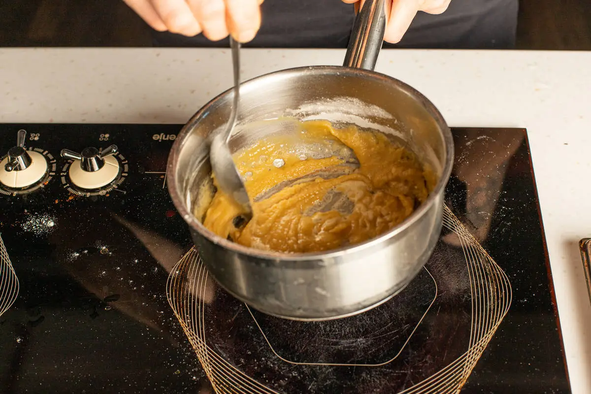 Сначала приготовьте соус бешамель. Обжарьте муку на сухой сковороде до лёгкого орехового аромата, добавьте сливочное масло и перемешайте.