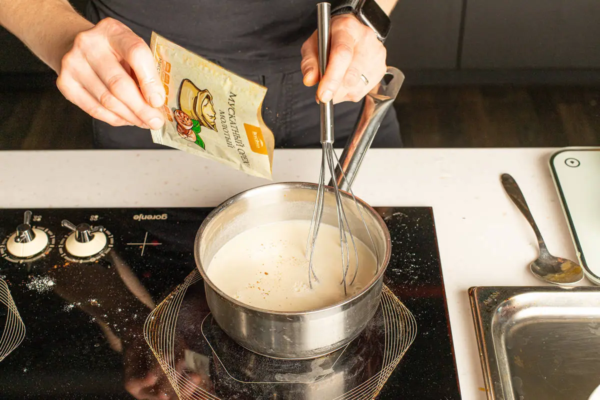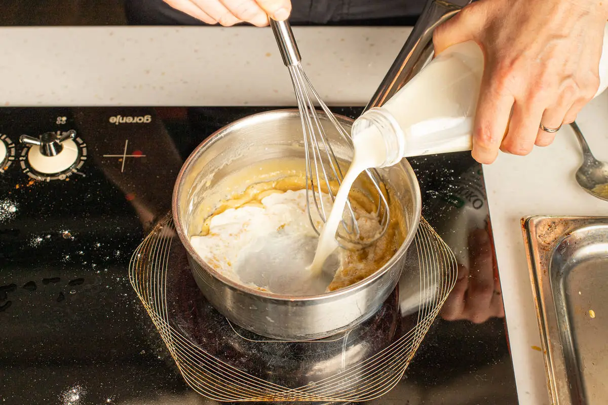 Ещё немного поджарьте, пока мука не разойдётся, влейте молоко, интенсивно размешивая лопаткой.