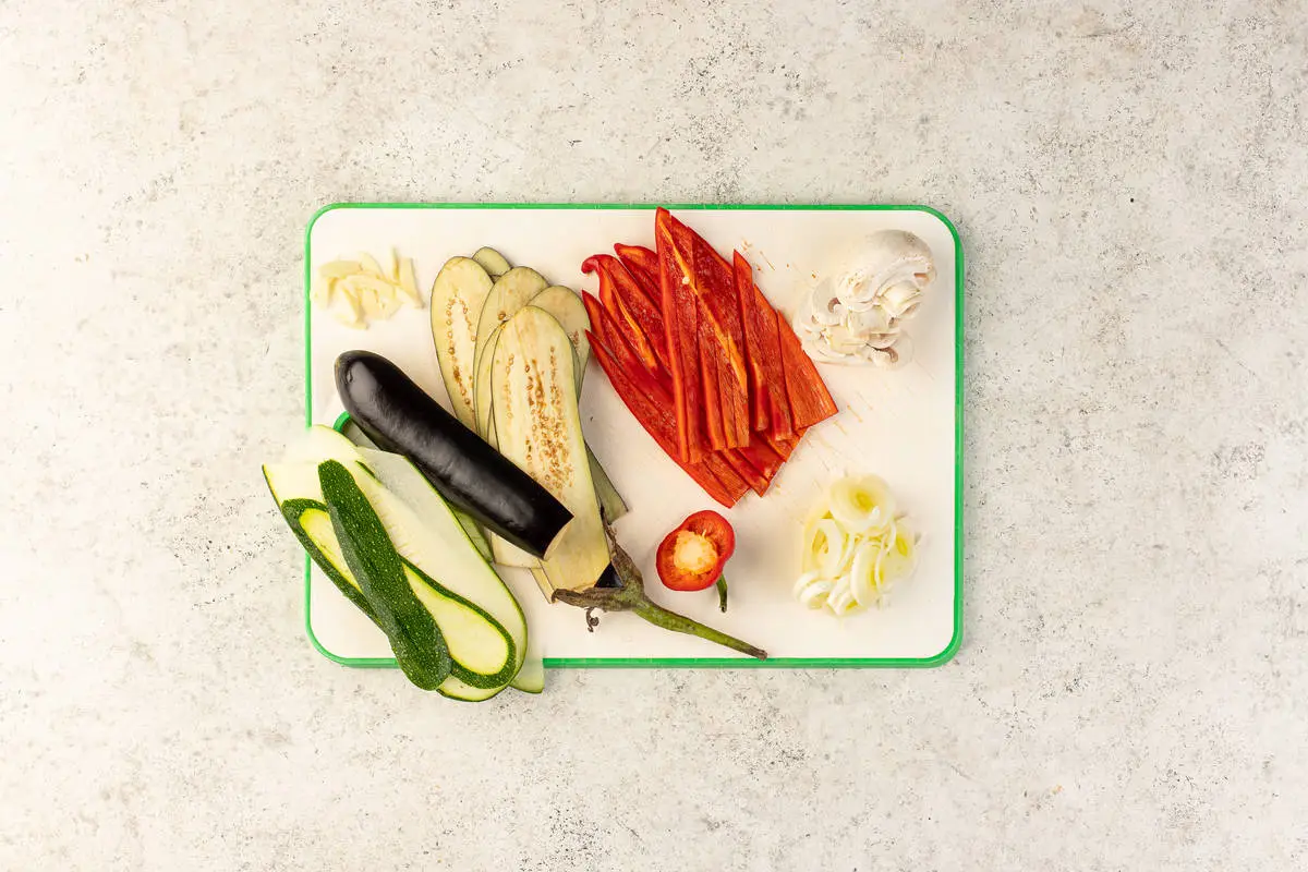 Нарежьте цукини и баклажан тонкими ломтиками или кружочками, порей — кольцами, перец — соломкой, шампиньоны — ломтиками, чеснок измельчите. Баклажан сразу посолите.