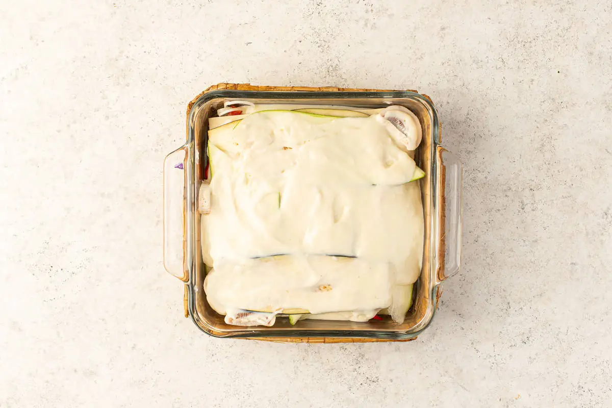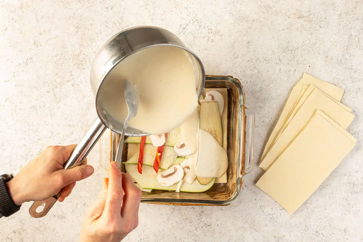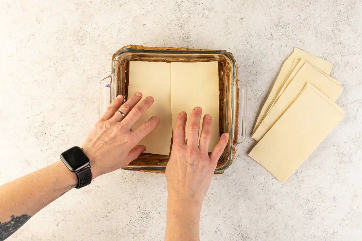 Полейте парой ложек соуса, закройте листами лазаньи и повторите слои несколько раз.